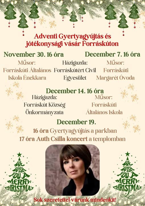 Várunk mindenkit sok szeretettel az adventi hétvégéinkre valamint a templomban AUTH CSILLA koncertjére