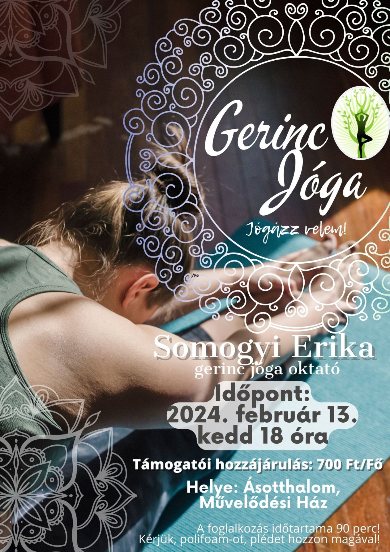 2024. február 13-án kedden este 18 órától a Művelődési Házban, Somogyi Erika gerinc jógaoktató várja a jóga kedvelőit.