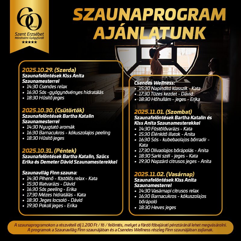 A rendszeres szauna programok keretében a vendégek kényeztetéséről és a professzionális szaunázásról képzett szaunamesterek gondoskodnak.