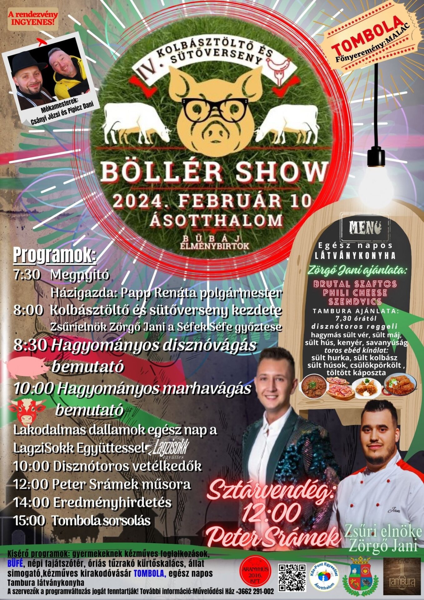 Ásotthalom Nagyközségi Önkormányzat 2024. február 10-én szombaton 7 órától szeretettel vár minden kedves látogatót a IV. Böllér Show & Kolbásztöltő és sütőversenyre a Bűbáj Élménybirtokon (6783 Ásotthalom, Béke u. 14.).