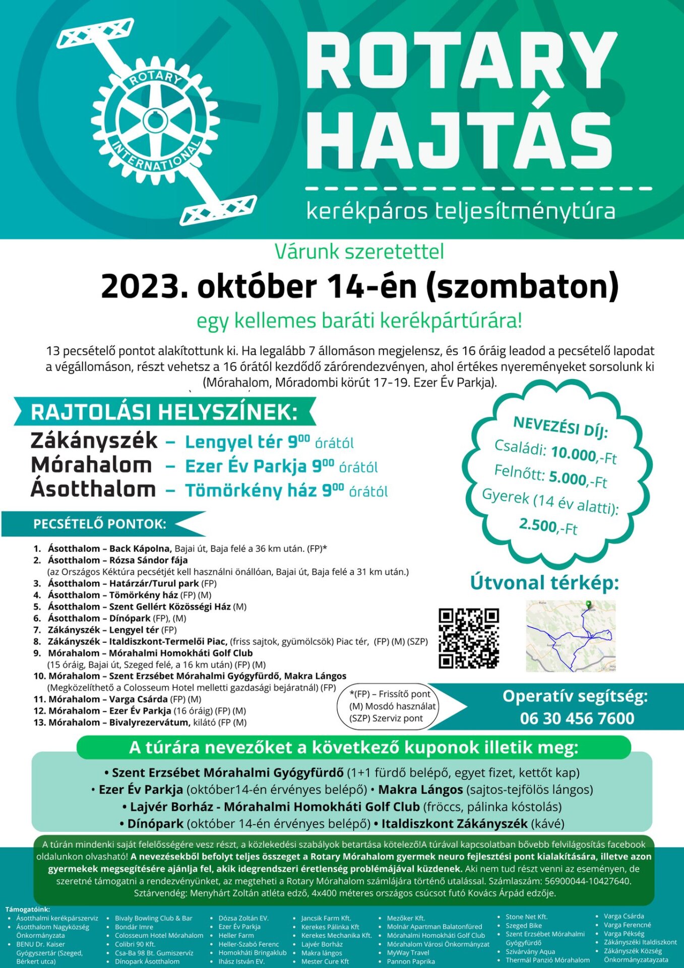 A Rotary Club Mórahalom Egyesület tagjai a klub alapelveinek - jószándék, segítségnyújtás -, a cselekvő humanizmus jegyében a Rotary hajtás elnevezésű program bevételét azon gyermekek megsegítésére ajánlja fel, akik idegrendszeri éretlenség problémájával küzdenek.