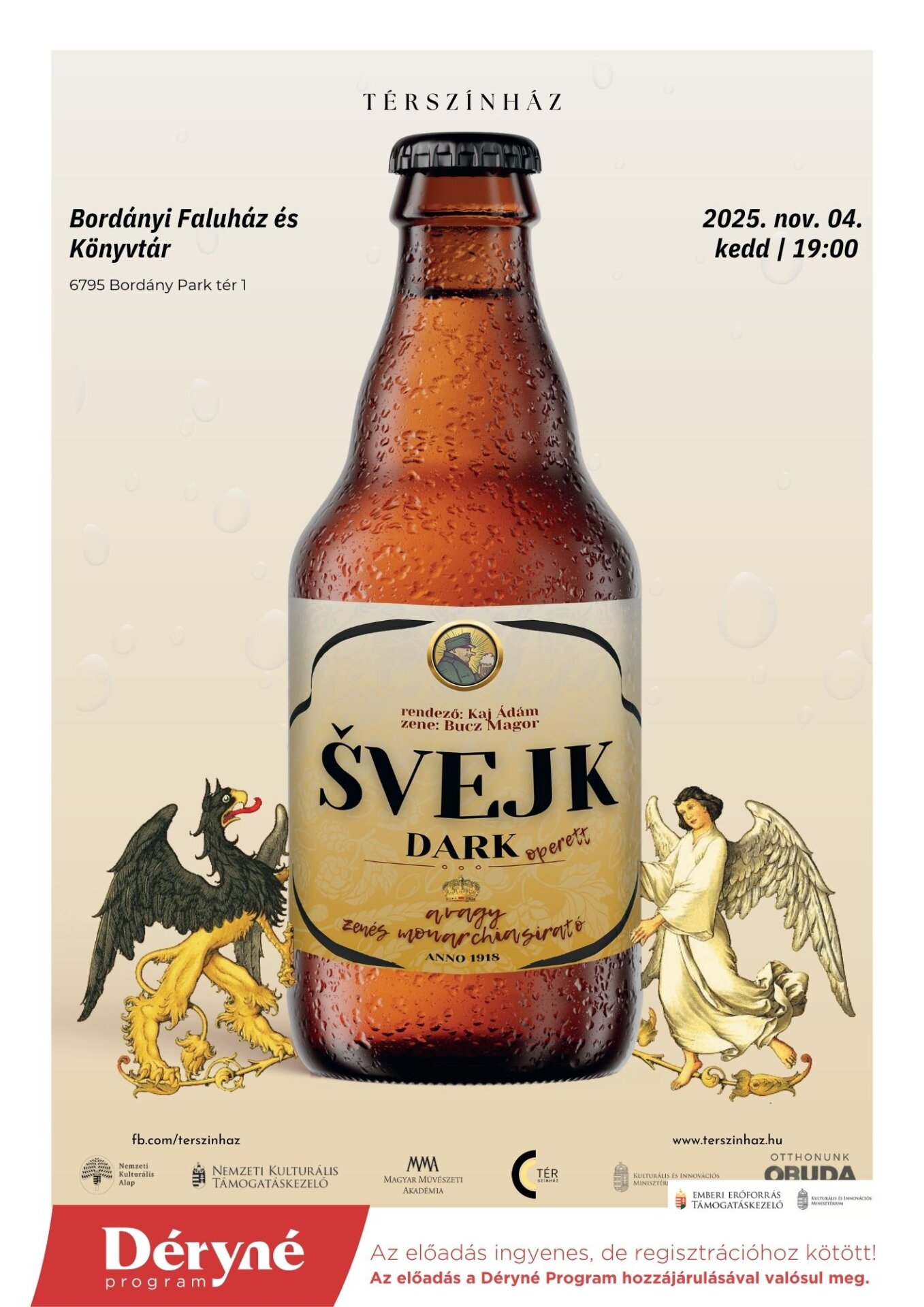 Szeretettel várunk mindenkit november 4-én, kedden 19 órától a bordányi Faluházban, ahol a Svejk című előadás kerül színpadra a Déryné Program támogatásával!