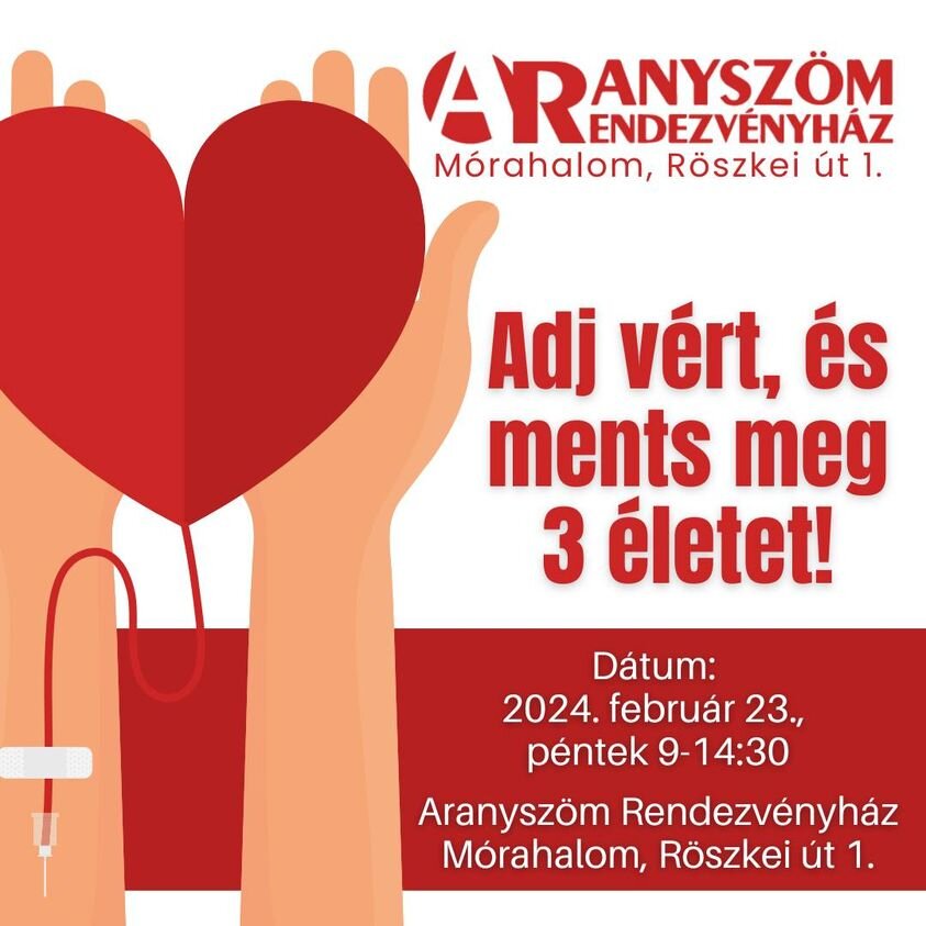 JÖSSZ ÉLETEKET MENTENI? Akkor adj vért, és ments meg három életet velünk! Időpont: 2024. február 23., pénteken 9 és 14:30 között.