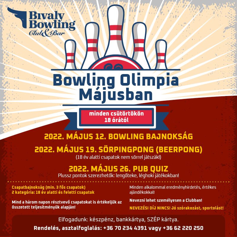 Májusban csütörtökönként BOWLING OLIMPIA a Bivaly Bowling Club&Bar-ban!