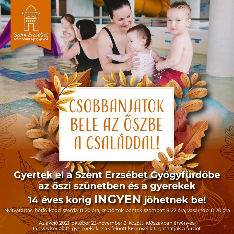 Gyertek el a Szent Erzsébet Gyógyfürdőbe az őszi szünet ideje alatt (október 23-november 02. között) és a gyermekek 14 éves korig INGYEN* jöhetnek be!