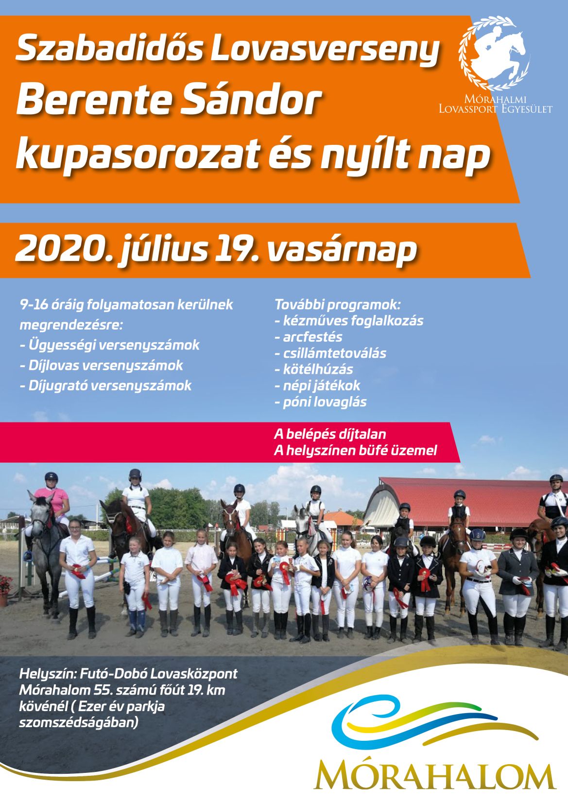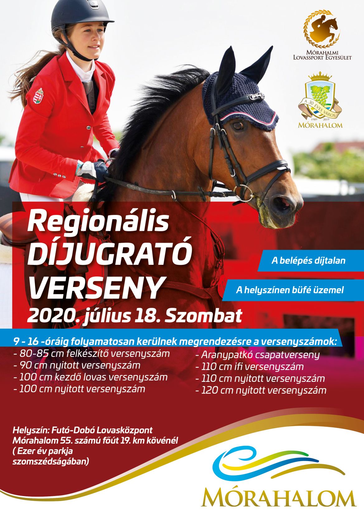 Regionális díjugrató versenyt és Szabadidős Lovasverseny Berente Sándor kupasorozat és nyílt nap lesz július 18-án és 19-én a mórahalmi Futó-dobó Lovasközpontban. A versenyszámok és a programok 9 órától 16 óráig folyamatosan lesznek megrendezve.