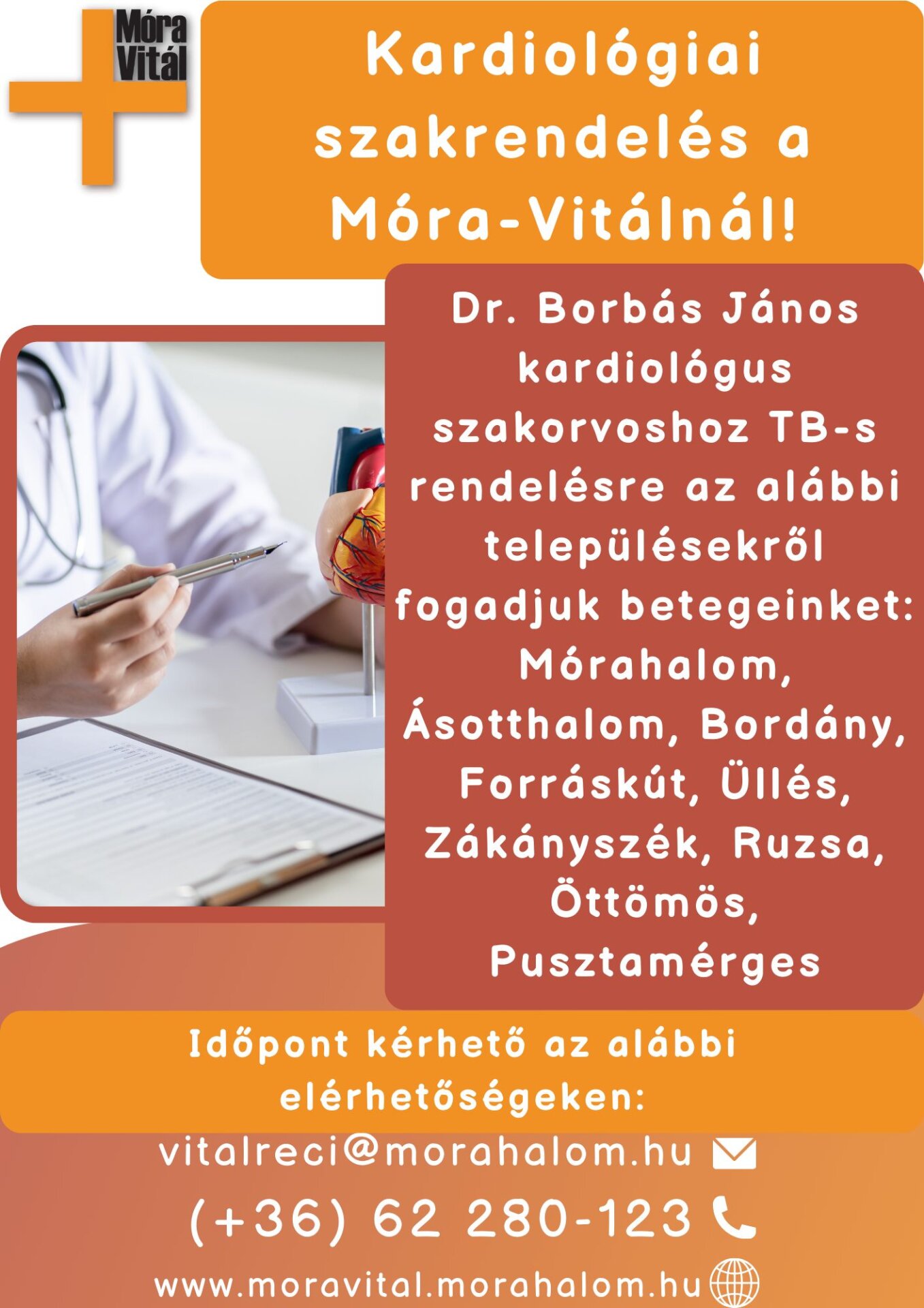 A Móra-Vitál Járóbeteg-szakellátó és Fürdőgyógyászati Központban Dr. Borbás János kardiológus TB-támogatott rendelése várja azokat, akik szeretnék ellenőriztetni szívük egészségét.