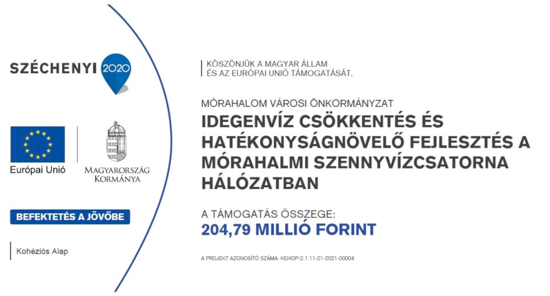 A KEHOP-2.1.11-21-2021-00004 azonosítószámú, „Idegenvíz csökkentés és hatékonyságnövelő fejlesztés a mórahalmi szennyvízcsatorna hálózatban” című pályázat nettó 292.562.599,- Ft összköltségű, melyből 70%-os részt, azaz 204.793.819,- Ft-ot támogatásból finanszíroztunk. Mórahalom Városi Önkormányzat 30% önerővel, 87.768.780,- Ft-tal járult hozzá a megvalósításhoz.