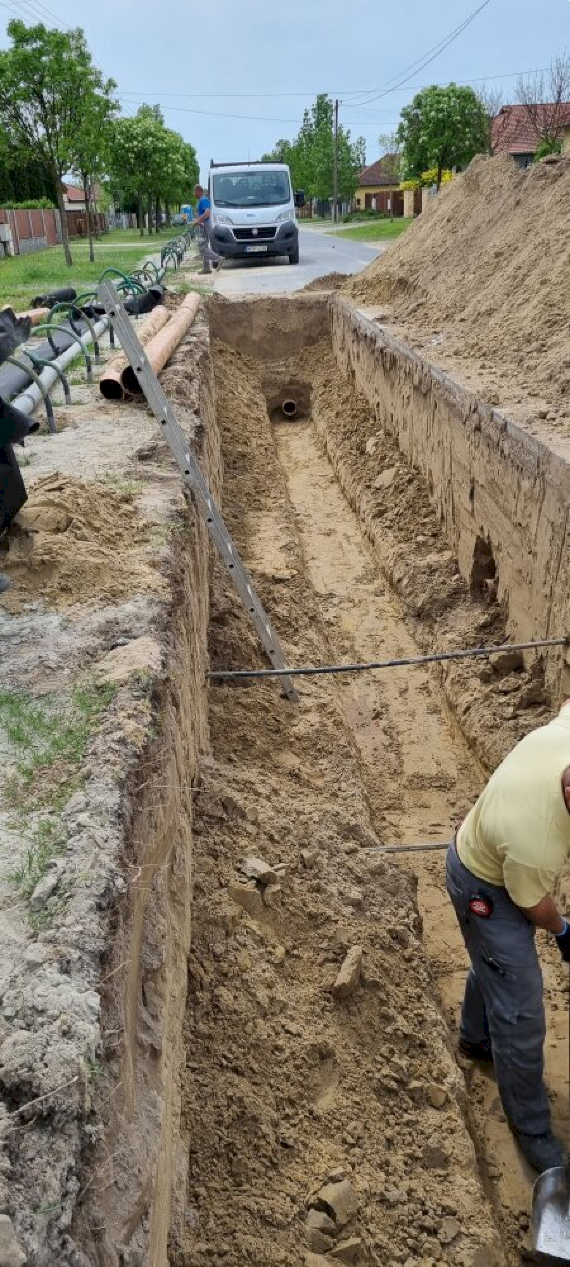 Az építés kivitelezője a mórahalmi székhelyű RMB-Transz Kft volt, mely cég a munkálatokat befejezte. A felújított szennyvízgyűjtő-hálózat szakasz hossza 2496 m. A 90 napos konszolidációs időszak alatt kialakult a megfelelő talajtömörség, illetve a szükséges és megfelel eredményt adott csatorna-kamerázás végeztével az aszfaltozott útba vágott munkaárkok felületét visszaaszfaltoztuk.