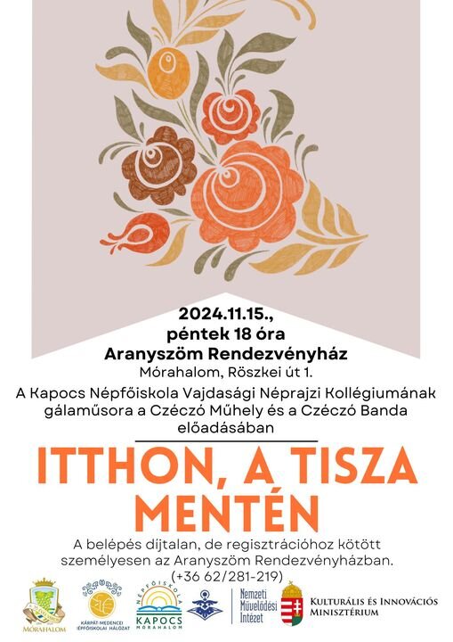 2024.11.15., péntek 18 óra Aranyszöm Rendezvényház (Mórahalom, Röszkei út 1.). A Kapocs Népfőiskola Vajdasági Néprajzi Kollégiumának gálaműsora a Czéczó Műhely és a Czéczó Banda előadásában. A belépés díjtalan, de regisztrációhoz kötöttt: személyesen az Aranyszöm Rendezvényházban. (+36 62/281-219)