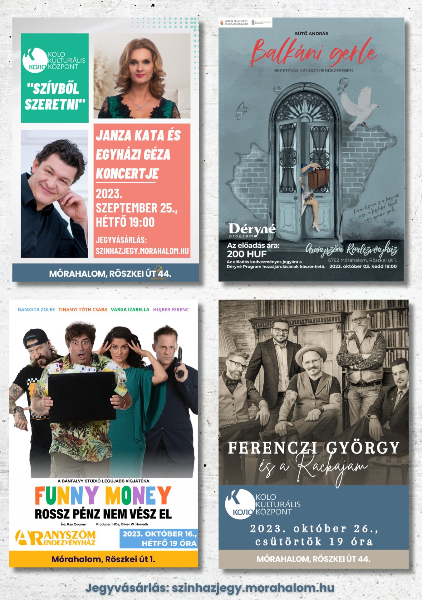 Az évadot Janza Kata és Egyházi Géza kettőse nyitja, ők szeptember 25-én „Szívből szeretni” című műsorukat hozzák el a városba, a Kolo Szerb Kulturális Központba. Az EMeRTon és Honthy-díjas színésznő és musical énekesnőtől, valamint a színész-énekestől operett-és musicalrészleteket, világhírű slágereket hallhatunk majd. A koncert előtt a helyszínen este 18 órától a megújult mórahalmi Vanilla Étterem és Cukrászda mini cukrászati bemutatót és vásárt tart.