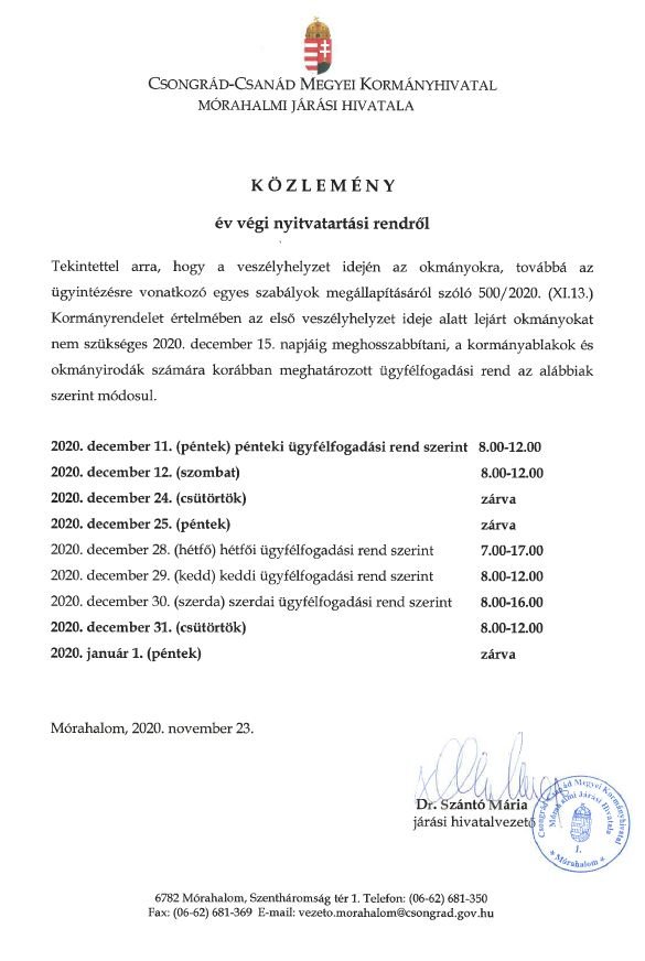 Közlemény a Csongrád-Csanád Megyei Kormányhivatal év végi nyitvatartásáról