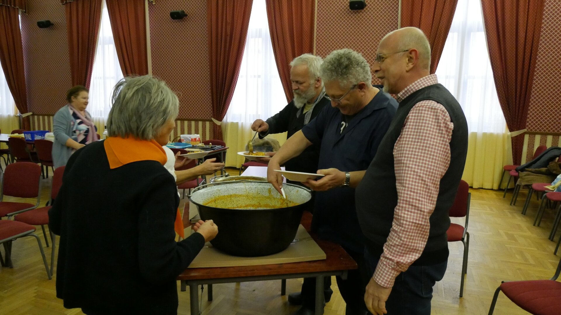 A menüről Duka Félix, a Móranet Nonprofit Közhasznú Kft. ügyvezető igazgatója, és Pápai Péter, a Tóth János Szakképző Iskola szakács szakoktatója gondoskodott. A rendezvényház udvarán slambucot és pörköltet főztek bográcsban. Az Aranyszöm munkatársai pedig apró ajándékokkal köszönték meg az egész éves együttműködést, majd megérkezett a „meglepetésvendég”, Nógrádi Zoltán is. A polgármester köszöntőjében arról beszélt, hogy gyermekkorában az ünnep kívül és belül is ünnep volt, nem csak a lelküket öltöztették díszbe, hanem szép ruhát öltöttek, szépen megterítették a karácsonyi asztalt. Hozzátette, ma már egyre kevésbé van ez így, ezért arra kérte a vendégeket, őrizzék ezeket a hagyományokat, hátha a következő generációk sem felejtik el, milyen valójában az ünnep, mit jelent a karácsony. Nógrádi Zoltán megköszönte a nyugdíjas klub és a parasztkórus tagjainak munkáját, azt, hogy bármikor és bármiben számíthattak és számíthatnak egymásra.