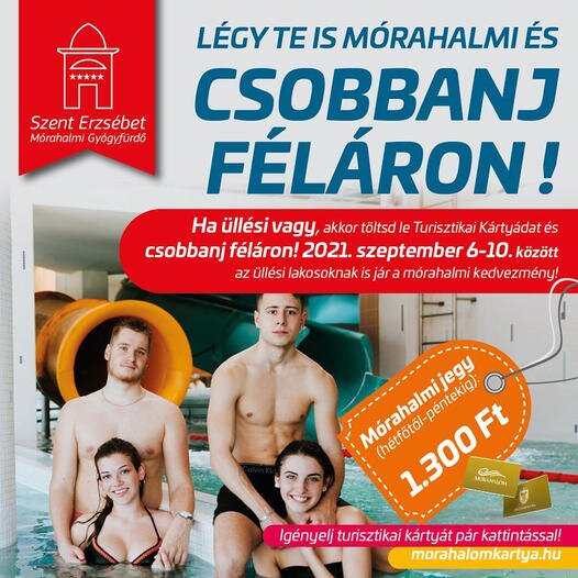 Üllési vagy? Akkor csobbanj féláron a mórahalmi fürdőben!Töltsd le Turisztikai Kártyádat a www.morahalomkartya.hu oldalon és 2021.09.06-10. között, hétfőtől-péntekig 1.300 Ft-ért vásárolhatsz belépőjegyet a Szent Erzsébet Mórahalmi Gyógyfürdőbe!