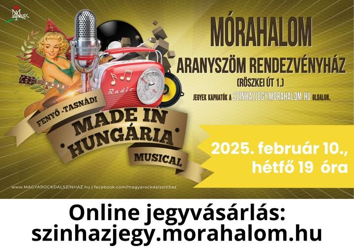 Fenyő Miklós – Tasnádi István: MADE IN HUNGÁRIA - musical az Aranyszöm Rendezvényházban! 2025. február 10., hétfő 19 óra Aranyszöm Rendezvényházban (Mórahalom, Röszkei út 1.)