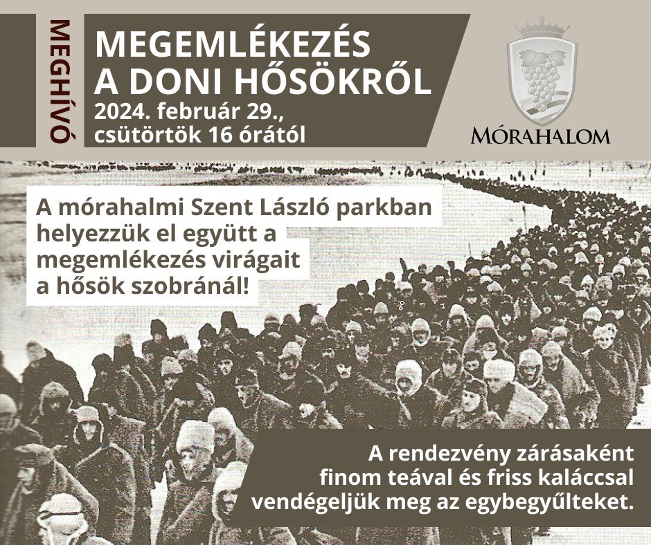 február 29., csütörtökön reggel indul a Doni emléktúra a szegedi Belvárosi temetőből, majd a domaszéki állomás után 16 órától, Mórahalmon koszorúzással emlékezünk a hősökre.