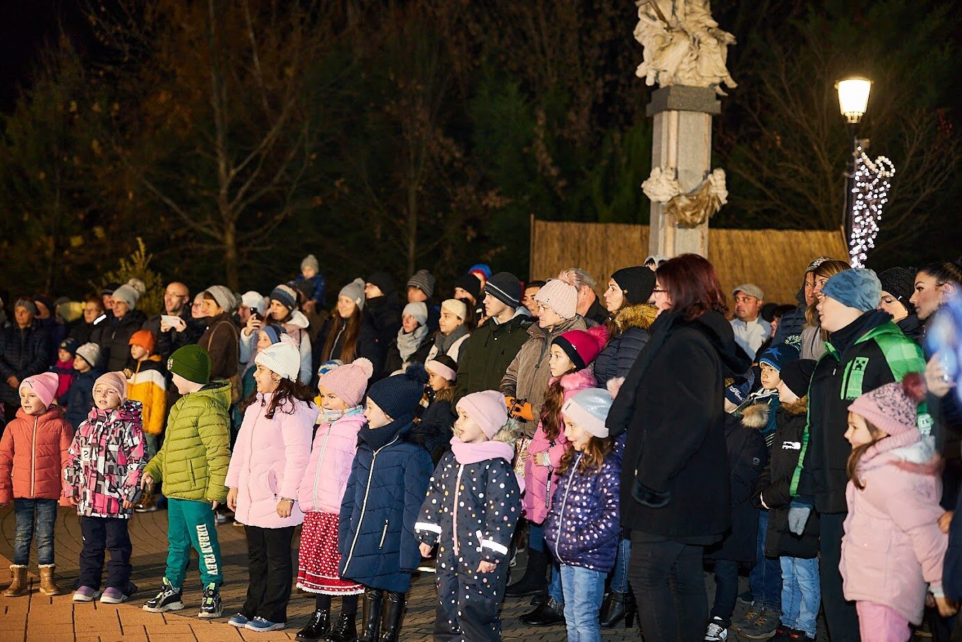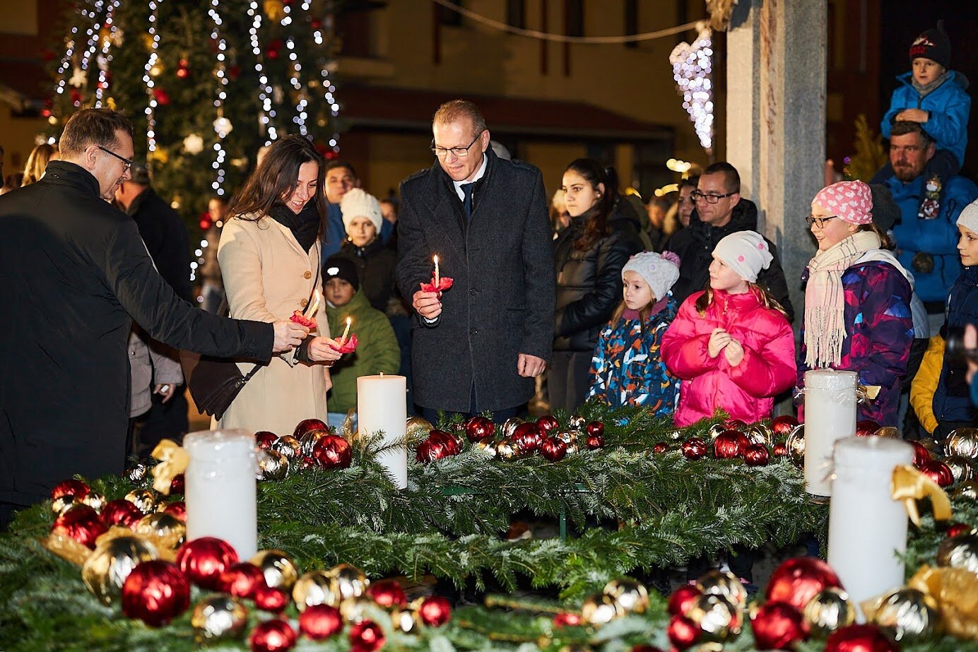 A város óvodásai adtak műsort vasárnap este az adventi koszorú első gyertyájának fellobbanása előtt. A meggyújtott gyertya fénye a növekvő világosságot és Jézus eljövetelét jelenti a keresztények számára. A hit jelképe Ádámot és Évát szimbolizálja, akiknek elsőként ígért Isten megváltást.