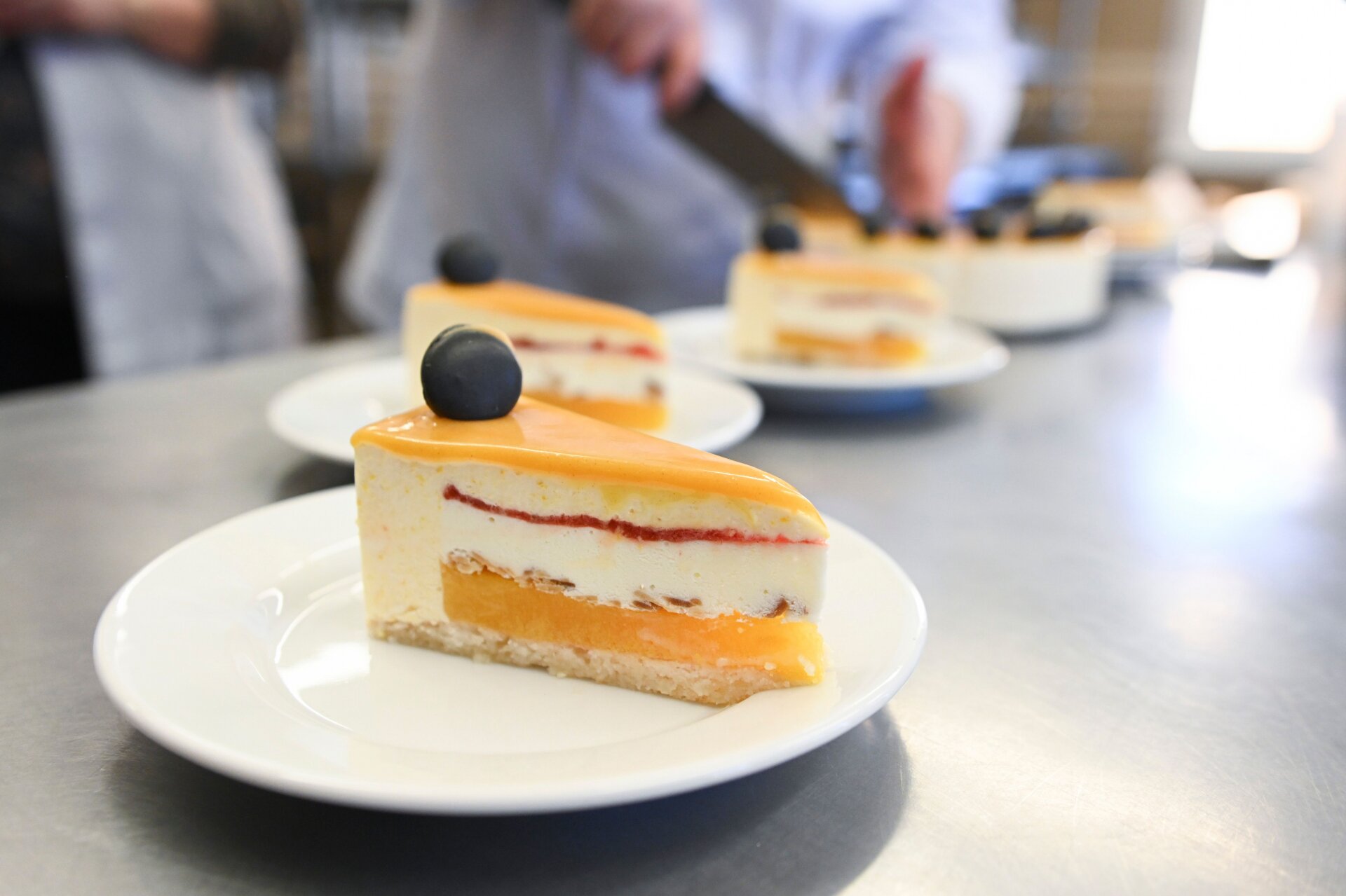 – Ez a mai trendeknek megfelelő mousse torta, zselébetéttel, roppanó réteggel és tésztával. Különböző textúrák és rétegek jelennek meg benne. Van benne mandulával készült habos réteg, őszibarackzselé homoktövissel savanyítva, a teteje tükörglazúr, egy zselatinos, fehér csokoládés, sűrített tejes réteg – sorolta, majd végre felvágta a gyönyörű tortát.