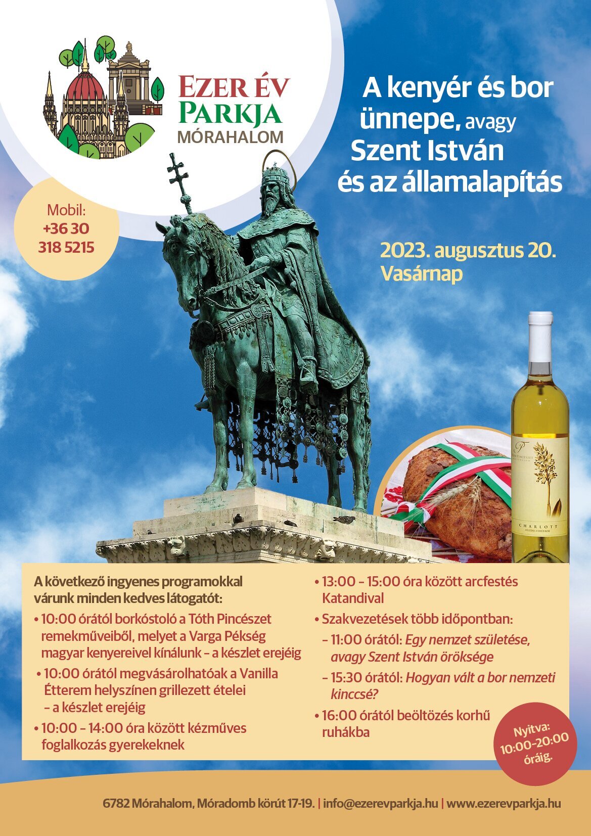 Nyárvégi élmények átélésére invitálunk augusztus 20-án! Az Ezer Év Parkjában ezen a vasárnapon számos ingyenes, családbarát program fogja biztosítani a kellemes kikapcsolódást és a feltöltődést. Látogassatok el hozzánk, hogy maradandó élményekkel telítődjetek az államalapításunk ünnepnapján!