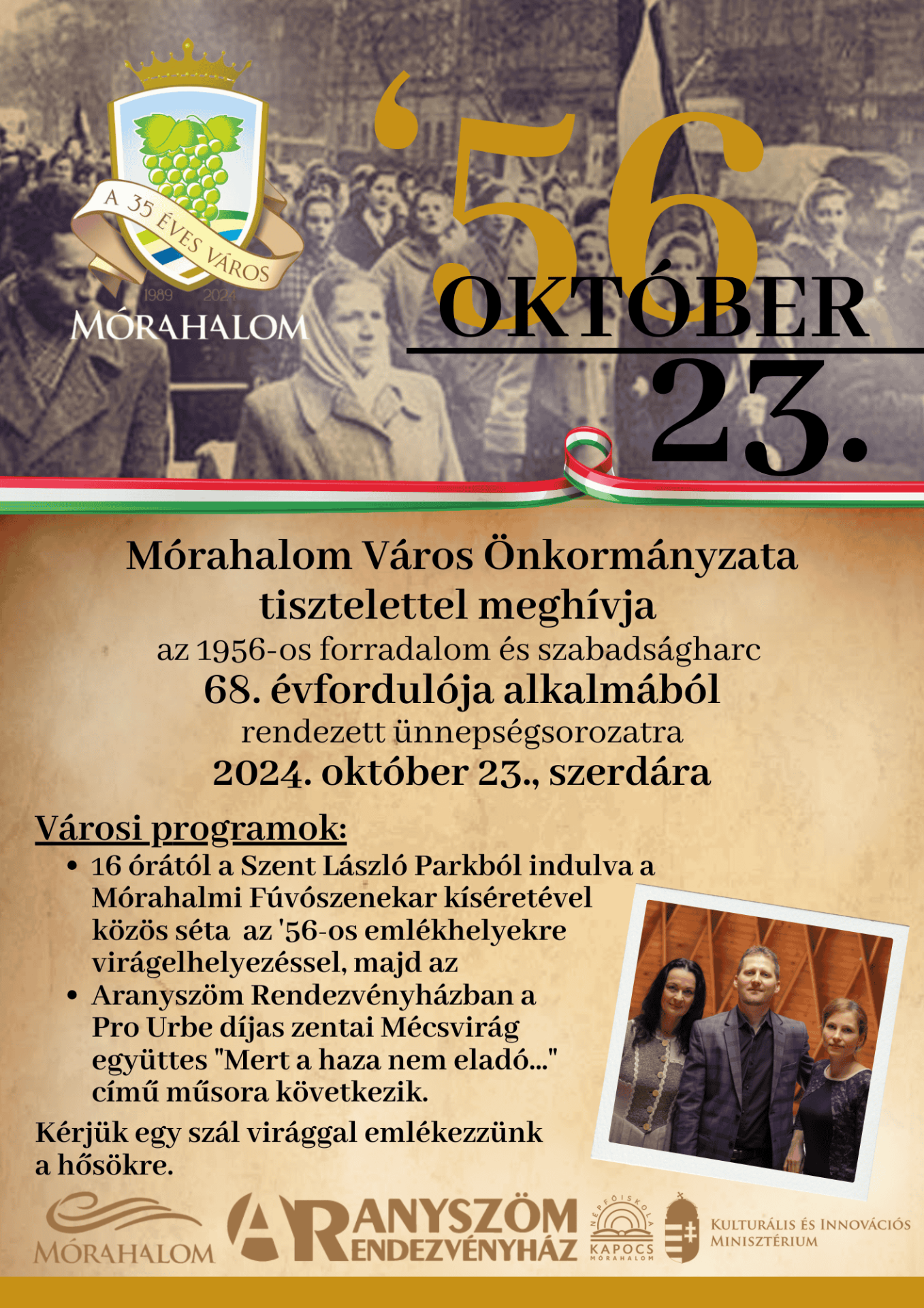 2024.10.22.Mórahalom Város Önkormányzata tisztelettel meghívja az 1956-os forradalom és szabadságharc 68. évfordulója alkalmából rendezett ünnepségsorozatra.