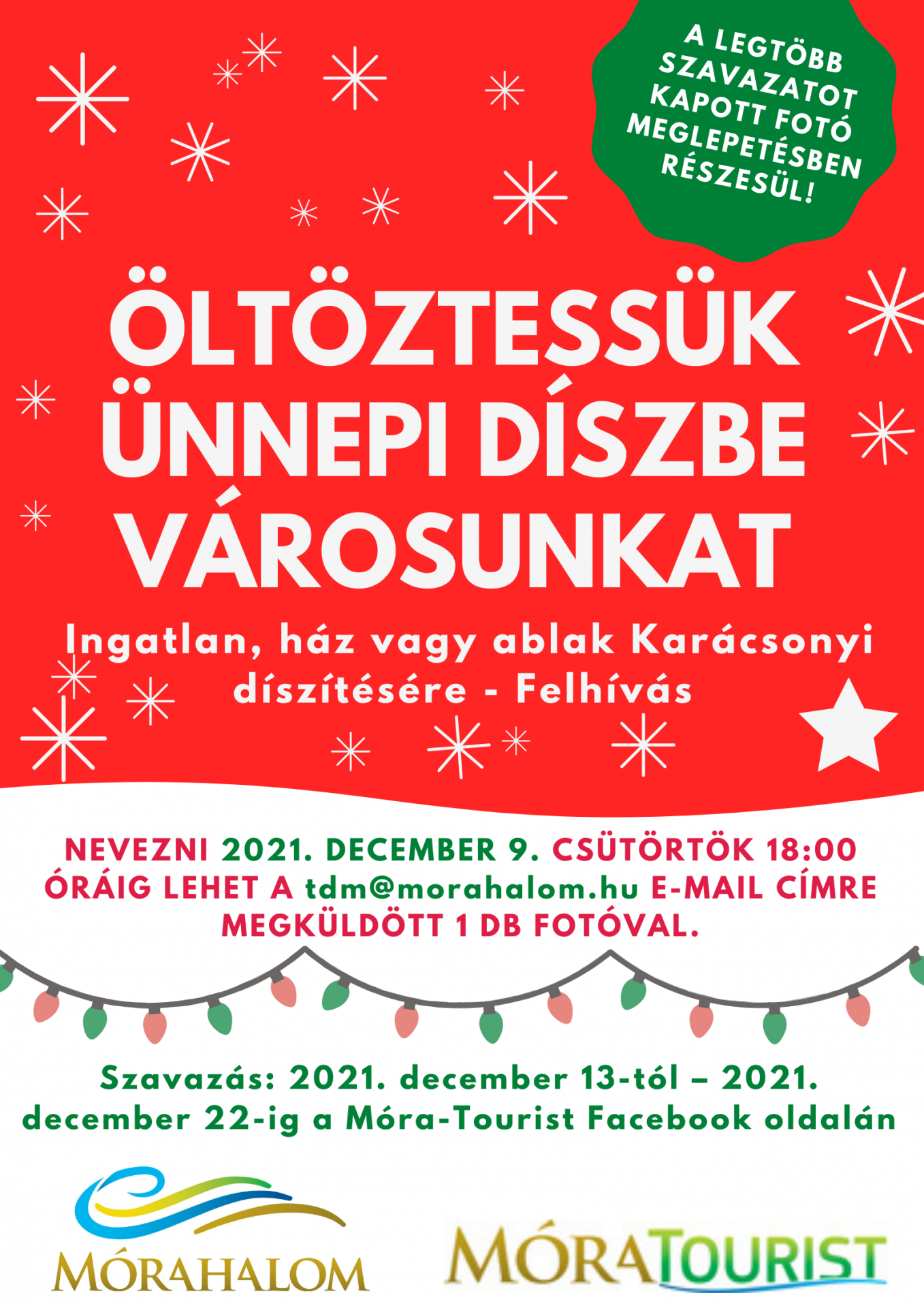 A levélben kérjük megadni a nevező család nevét, címét és telefonszámát! A képeket feltesszük a Móra-Tourist Nonprofit Kft. facebook oldalára, melyekre 2021. december 13-tól – 2021. december 22-ig lehet szavazni reakciógombokkal.