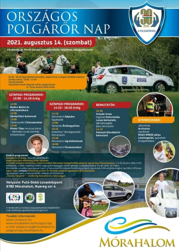 Mórahalmon, augusztus 14-én Országos Polgárőr napot tartanak a Futó-Dobó Lovasközpontban. A rendezvény létrejöttét több hónapos előkészületek előzték meg. Az ünnepi műsor és köszöntő mellett lesznek színpadi produkciók, különféle bemutatók és a gyerekek sem maradnak programok nélkül.