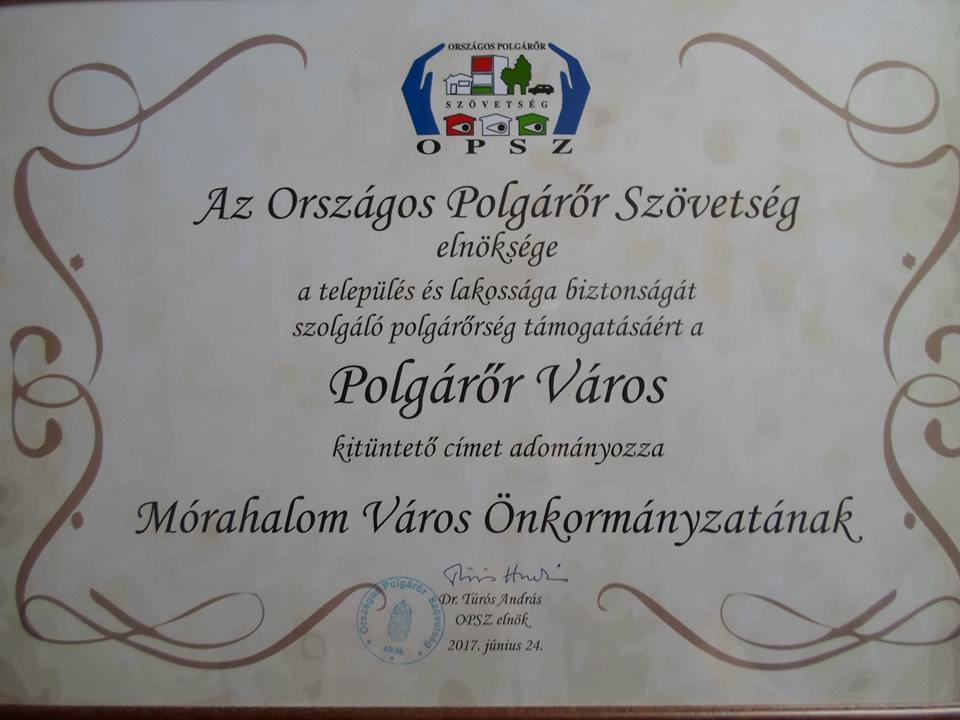Az Országos Polgárőr Szövetség Elnöksége „Polgárőr Város” kitüntető címet adományozott Mórahalom Város Önkormányzatának.