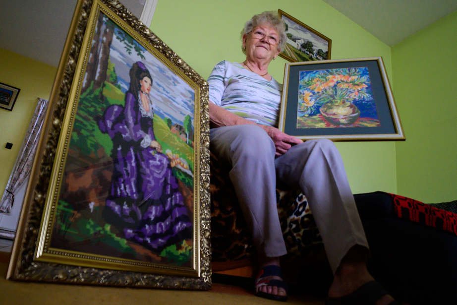 – Margó néni férje, majd indult is az emeltre, hogy lehozza felesége egyik legszebb munkáját, a Szinyei Merse Pál: Lilaruhás nő című festménye alapján készült goblent, amin fél évig dolgozott. Mostani munkájáról nem beszélt, mert titok. De azért csak kiderült: az énekkar ötvenedik születésnapjára az emléklapot tartalmazó mappára készít keresztszemes hímzést mind a tizenöt tagnak