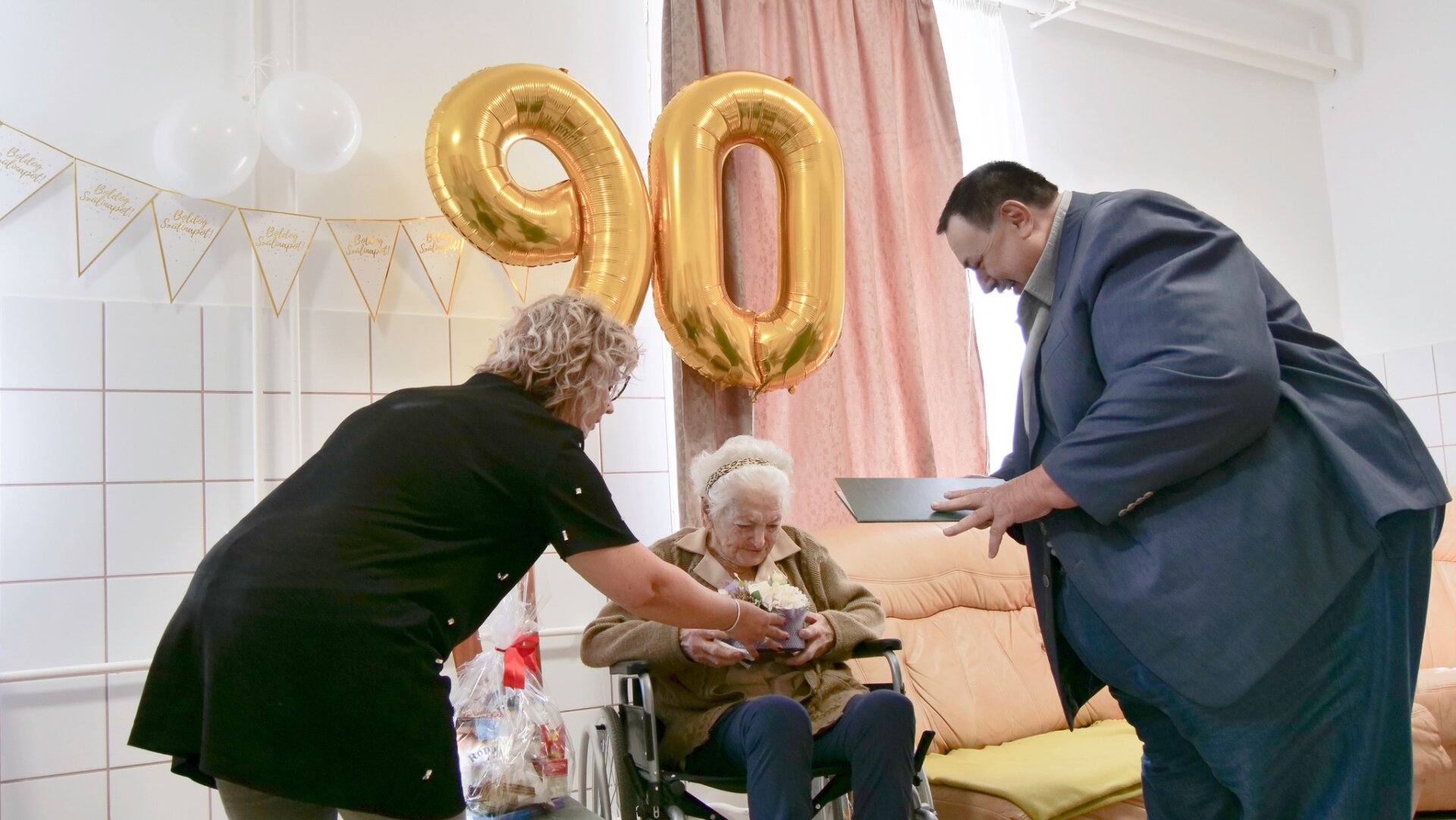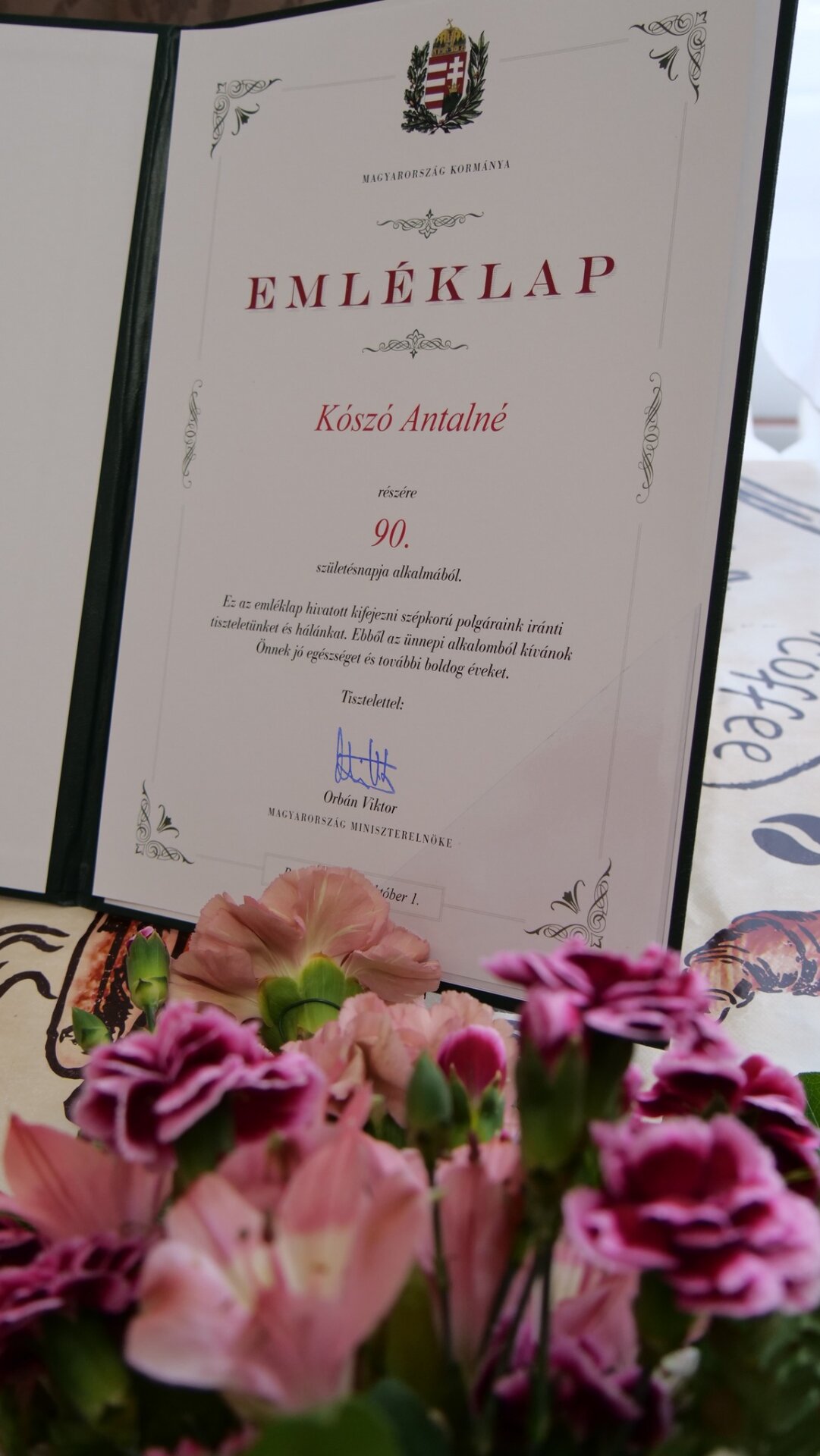 Mórahalom Város Önkormányzata nevében Csányi László alpolgármester köszöntötte a 90 éves Kószó Antalnét az Idősek Napja alkalmából. Átadta továbbá az Orbán Viktor miniszterelnök üdvözletét tartalmazó emléklapot is.