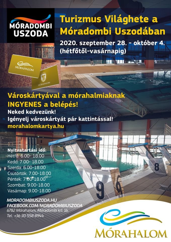 Turizmus világhete a Móradombi Uszodában szeptember 28. és október 4. között. A városkártya használatával a Mórahalmiak ingyenesen léphetnek be az uszoda területére.