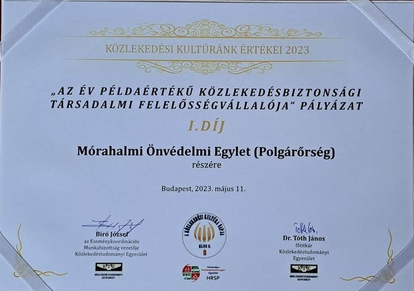 A Közlekedési Kultúra Napja rendezvénysorozathoz kapcsolódva idén a Mórahalmi Önvédelmi Egylet-Polgárőrség vehette át az év példaértékű közlekedésbiztonsági társadalmi felelősségvállalójának járó díjat, megosztva az Országos Polgárőr Szövetséggel, a Baranya Vármegyei Polgárőr Egyesületek Szövetségével, és a Csóri Polgárőrséggel. Gratulálunk az elismeréshez!