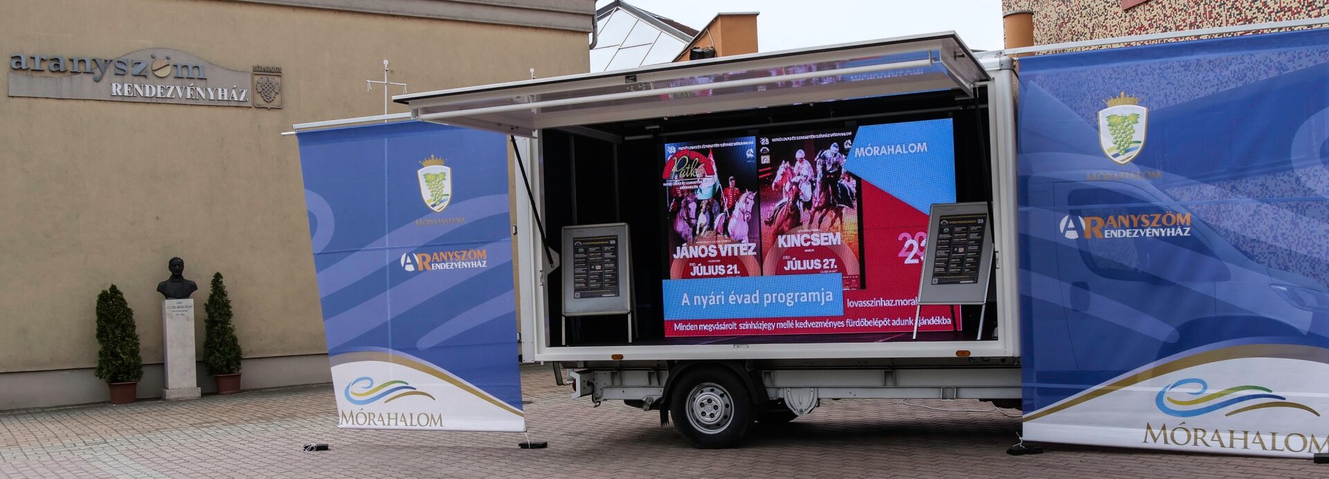 A gyorstelepítésű LED-falas mobil színpad fél óra alatt bárhol felállítható, így kisebb volumenű előadásokra tökéletesen alkalmas.