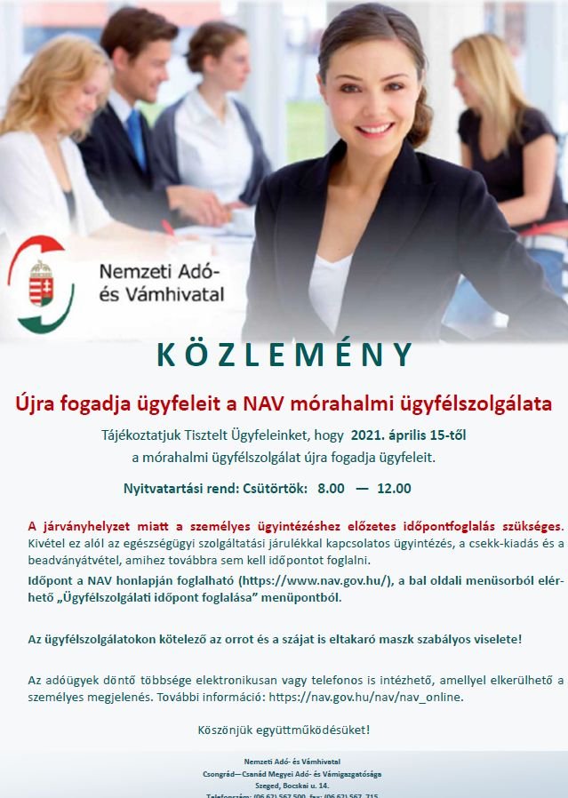 2021.04.09.Tájékoztatjuk Ügyfeleinket, hogy 2021. április 15-től a mórahalmi NAV ügyfélszolgálat újra fogadja ügyfeleit.