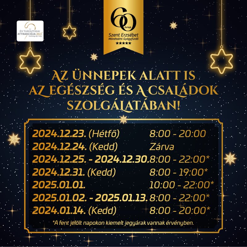 Az ünnepek alatt is várunk szeretettel minden fürdőzni, kikapcsolódni vágyó vendéget! www.erzsebetfurdo.morahalom.hu