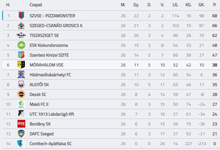 Paksi Péter: – Köszönöm a csapat egész éves teljesítményét, valamint Kelemen Balázs és Gyárfás Sándor áldozatos munkáját! Nagy bravúrnak tartom, hogy végig mögöttünk tartottuk a Szeged-Grosics II.-t, akik profi játékosokkal megerősített csapattal játszották végig a bajnokságot. Nehezen törtük fel a Mórahalom védekezését, de az első félidő végén lőtt gólunk megnyugtatta a csapatot, a szünet után felszabadultan játszhattunk.